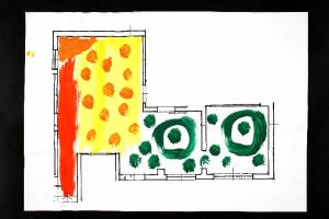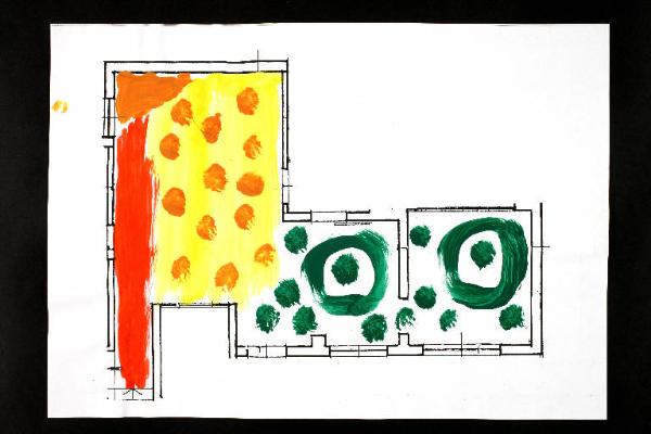 acrilico e acrilico acquerellato su fotocopia di carta bianca. Colore: nero, verde permanente chiaro, giallo, arancio, rosso. Soggetto: progetto di pavimento. Disegno firmato e datato sul verso: "Savino", "18.02.02".