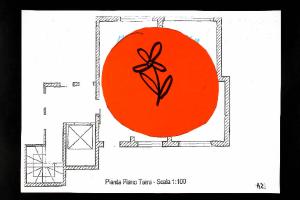 tecnica mista e collage: cartoncino colorato, pennarello, colla vinilica su fotocopia di carta bianca. Colore: nero, rosso, azzurro. Soggetto: progetto di pavimento. Scritta: "pianta piano terra - scala 1:100". Disegno firmato sul verso con pennarello nero: "Isa".