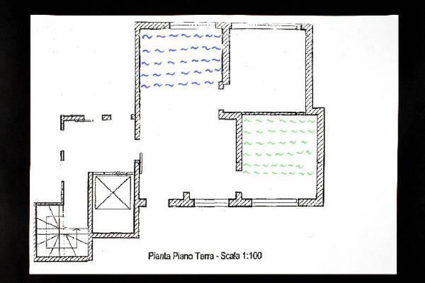 pennarello su fotocopia di carta bianca. Colore: nero, blu, verde chiaro. Soggetto: progetto di pavimento. Scritta: "pianta piano terra - scala 1:100".