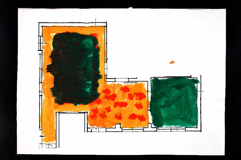 acrilico su fotocopia di carta bianca. Colore: nero, arancio scuro, verde scuro, verde chiaro, rosso, viola scuro. Soggetto: progetto di pavimento. Scritta: "pianta piano terra - scala 1:100". Disegno firmato e datato sul verso: "Savino, 18.02.02".