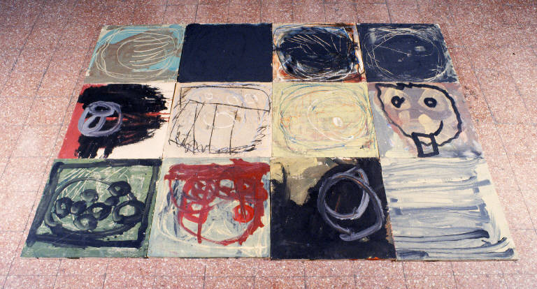 tecnica mista su truciolare: acrilico, smalti industriali, pastello a cera, gessetti colorati. Colore: nero, rosso, grigio, verde pallido, verde marcio, marrone, ocra, beige verde. Opera composta da dodici moduli in truciolare di cm. 51x50,5 ognuno.