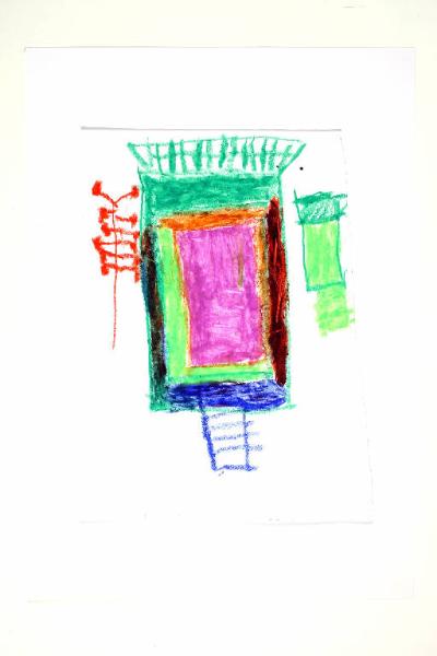 pastello a olio su carta bianca. Colore: blu oltremare, verde pisello, verde opaco, rosso, viola chiaro, viola scuro, arancio medio, marrone. Soggetto: pianta di interno.
