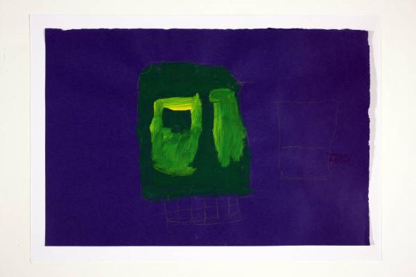 acrilico e matita su cartoncino colorato blu scuro. Colore: verde chiaro, verde scuro, grigio, giallo. Soggetto: elemento decorativo. Disegno firmato e datato sul verso: "Savino, 12/03/02".