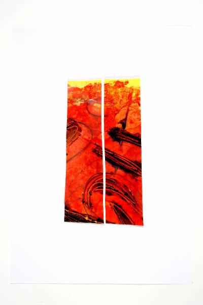 acrilico, fusaggine, matita, colore a olio, colla vinilica e plastica ritagliata su cartoncino giallo. Colore: rosso, blu di Prussia, giallo, arancio scuro, grigio scuro, terra di Siena bruciata scura. Soggetto: elemento decorativo. Disegno firmato e datato sul verso: "Angela, 25/02/02".