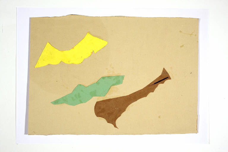 collage di cartoncino e colla vinilica. Colore: beige scuro, giallo, verde oliva chiaro, marrone chiaro, blu di Prussia. Soggetto: elemento decorativo.