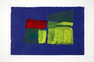 acrilico e matita su cartoncino colorato blu. Colore: verde opaco, verde vescica, rosso, giallo. Soggetto: pianta di interno. Disegno firmato e datato sul verso: "Savino, 12/03/02".