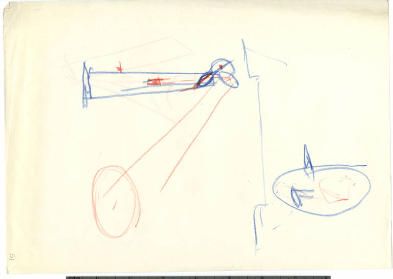 Schizzi in matita blu della lampada Gibigiana e schizzi in matita rossa per indicare la luce prodotta dalla lampada.