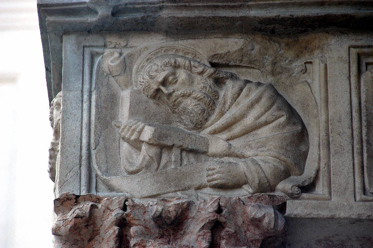 Rilievo in marmo bianco rosato di Candoglia scolpito: figura di apostolo racchiusa entro cornice quadrangolare.