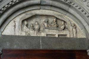 - NOTIZIE STORICO CRITICHE La lunetta è stata realizzata dalla bottega di Giovanni da Campione tra il 1364 e il 1367.\nL'opera è stata sottoposta a restauro conservativo nel 2001(consolidamento e pulitura; progetto e direzione architetto Giuseppe Napoleone, Soprintendenza ai Beni Architettonici di Milano; lavori eseguiti dalla ditta Lares, Venezia; cfr. Buonincontri, 2005, p. 214); un precedente intervento è documentato tra il 1978 e il 1981, sotto la direzione dell'architetto Sandro Angelini (Buonincontri, cit.).