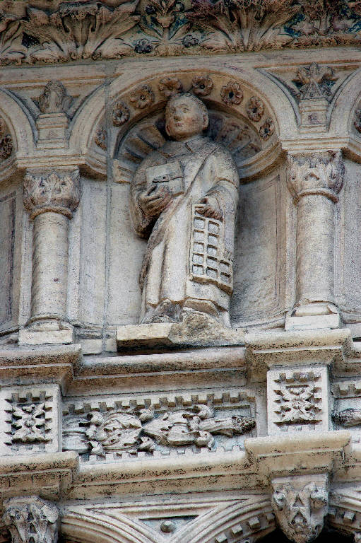 - NOTIZIE STORICO CRITICHE Il rilievo, come tutte le sculture del fregio posto sull'attico, è stato riferito da Costantino Baroni ad Andreolo de' Bianchi, orafo e scultore noto per la elegante croce prcessionale ornata di formelle a sbalzo eseguita nel 1392 per il tesoro della Basilica, e rubata diversi anni fa; ma l'assenza di opere certe di riferimento, nel catalogo dell'artista, non consente di confermare l'ipotesi avanzata da Baroni; restano validi, di quella proposta, la datazione, attorno alla fine del XIV secolo, e l'ambito culturale in cui si muove l'anonimo autore del fregio, che è certamente lombardo, per la grazia cesellata dei sontuosi ornati collocati con minuta cura su tutta la superficie del rilievo (C. Baroni "La scultura gotica lombarda", Milano 1944, p. 130; Lomartire, 2009, p. 74).\nL'opera è stata restaurata tra il 1999 e il 2000 (Buonincontri, 2005, p. 248).