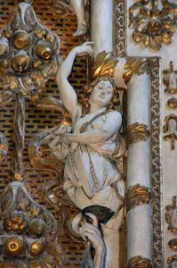 Figura di angelo in funzione di cariatide, con il braccio destro alzato.