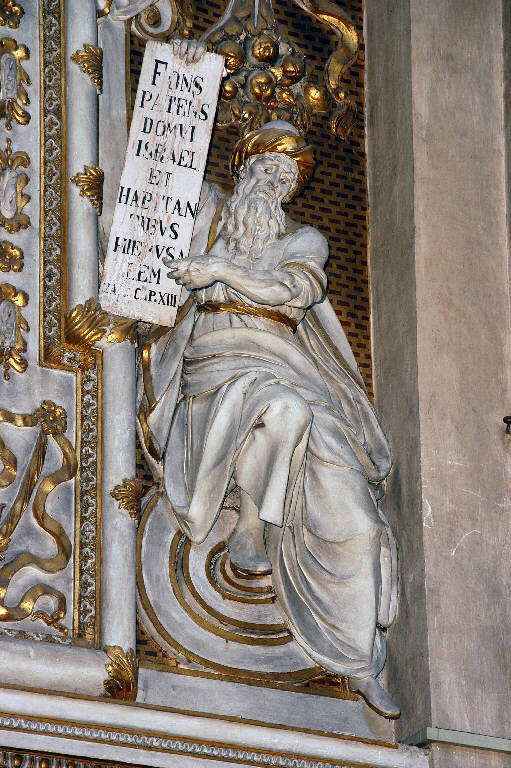 - NOTIZIE STORICO CRITICHE Non c'è nei documenti contabili della Congregazione della Misericordia Maggiore, una menzione esplicita della grande cornice ornata di angeli e profeti che racchiude il "Mosè fa scaturire l'acqua dalla roccia" di Antonio Zanchi: a mio avviso, la data del dipinto (1669), potrebbe fornire il termine ante quem per l'esecuzione degli stucchi, mentre il termine post quem potrebbe essere fissato al 1659, l'anno in cui Giovanni Angelo e Gerolamo Sala cominciano i lavori per la decorazione del transetto sinistro.\nAndrea Spiriti (2009), per spiegare il tono più libero e dinamico di questa parte della decorazione, evidente soprattutto nelle grandi figure di profeti, suggerisce l'ipotesi di un intervento, almeno in fase di progettazione, di Giovanni Battista Barberini, che è però documentato a Bergamo solo nel 1683.