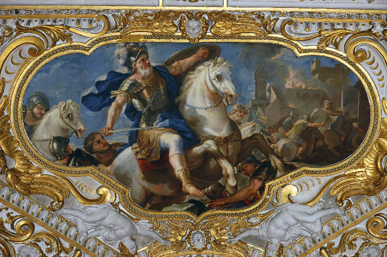 - NOTIZIE STORICO CRITICHE Il dipinto racconta un episodio tratto dal libro di Giosuè (6): il grande condottiero israelita lancia l'assalto alla città di Gerico in fiamme, alzando lo scudo, La tela fu eseguita da Nicolò Malinconico trail 1693 e il 1694, come tutte le altre che ornano la volta della prima campata della navata centrale (Noris, in "I pittori bergamschi...Il Seicento", vol. IV, pp. 167-168, scheda 12).\nL'opera è stata restaurata nel 1959 da Franco Steffanoni (cfr. relazione in data 9 settembre 1959, protoc. 1735, cat. MM, clas. IV, fasc. 5/c, Archivio Congregazione Misericordia Maggiore, Bergamo).