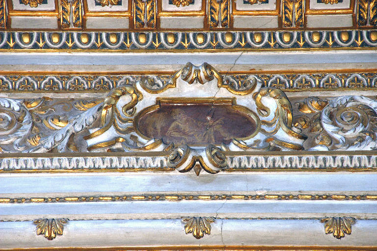 Cartiglio in stucco che racchiude una piccola figura maschile dipinta a monocromo.