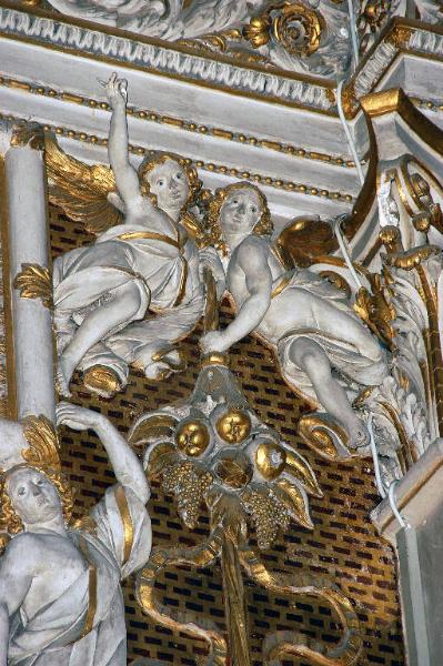 Coppia di angioletti che reggono un nastro concluso da un grande mazzo di fiori e frutti.