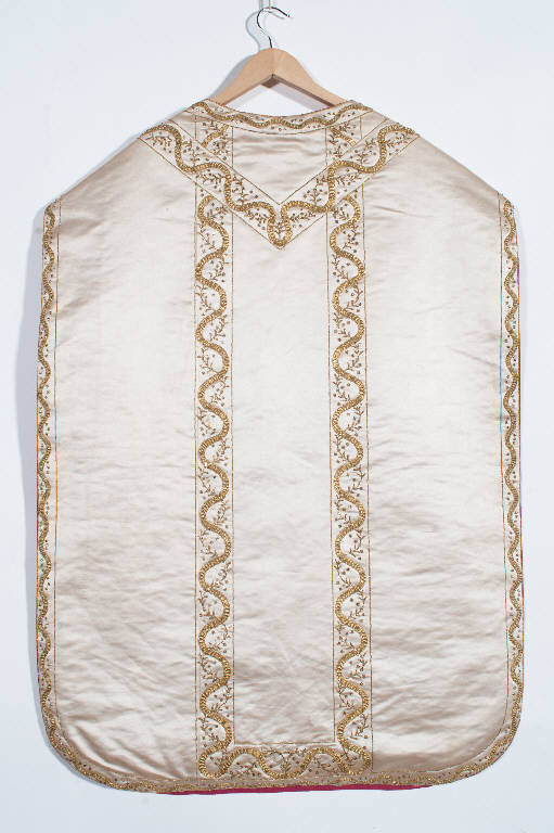 Pianeta in raso bianco. Il ricamo, eseguito in oro filato, oro laminato e canutiglia oro con applicazione di paillettes dorate, è posizionato lungo il perimetro e disegna anche croce e colonna sostituendo visivamente l'applicazione del gallone. Si tratta di un motivo di grande semplicità che presenta lo svolgersi ad "8" di un nastro e una ramificazione con piccole foglie. Fodera in cotone rosso.