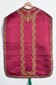 Pianeta in raso rosso. Il ricamo, eseguito in oro filato con applicazione di paillettes, sostituisce visivamente l'applicazione del gallone. Il disegno, che presenta lo svolgersi di un nastro dall'andamento sinuoso che si intreccia con motivi vegetali, si sviluppa lungo i margini perimetrali della veste. Di più importanti dimensioni quello chiamato a definire croce e colonna. Fodera in tessuto di seta verde.