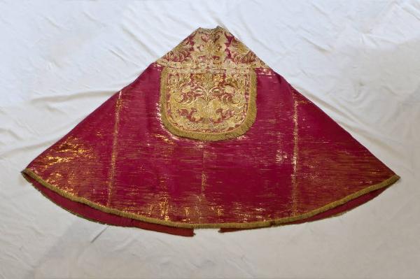 Serie di quattro piviali in raso rosso. Il ricchissimo ricamo, eseguito in oro filato, oro laminato e canutiglia oro, assume un'ampia struttura centralizzata che occupa tutta la superficie dello stolone e dello scudo. Dal centro dipartono tralci d'acanto con peonie contrapposti e speculari nella direzione che allargandosi in ampi girali si intrecciano con mensole, motivi mistilinei e margherite. Stolone e cappuccio sono delimitati da un fregio esagonale con motivi vegetali inseriti all'interno e nei punti di tangenza che visivamente sostituisce l'applicazione del gallone. Fodera in seta rossa.
