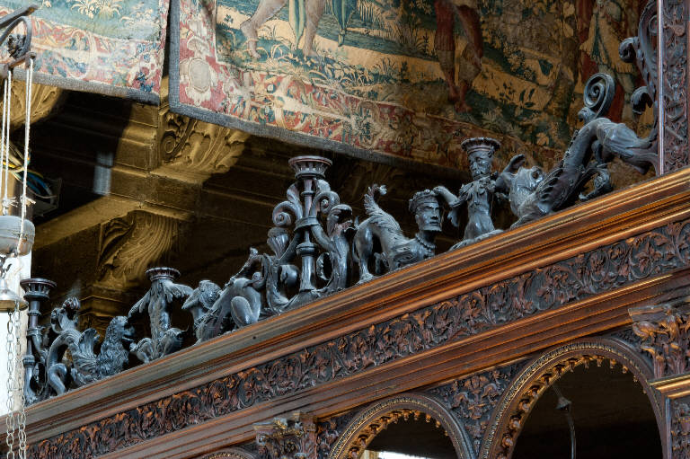 - NOTIZIE STORICO CRITICHE La cimasa fa parte dell'iconostasi del coro commissionato nel 1522 dal Consorzio della Misericordia Maggiore di Bergamo al legnaiolo e intarsiatore loverese Giovanni Francesco Capoferri, al quale, alla fine di ottobre, fu affiancato il marangone Giovanni Belli di Ponteranica per i lavori di intaglio. Il progetto della struttura del coro fu messo a punto dallo stesso Capoferri che visitò varie città del Nord-Italia per vedere altri cori intarsiati e che nel luglio-agosto 1523 si recò più volte a Milano dal pittore e architetto trevigliese Bernardo Zenale per sottoporgli il modello del coro. I cartoni delle tarsie figurative che ornano il coro furono affidate in un primo momento (29 ottobre 1523) al poco noto pittore bergamasco Nicolino Cabrini che morì poco dopo: il 12 marzo 1524 fu incaricato al suo posto Lotto, a cui il 2 giugno 1524 il Consorzio richiese anche i pannelli intarsiati ("coperti") che dovevano proteggere le preziose tavolette, i cui soggetti dovevano essere indicati dal principale teologo della città, fra Girolamo Terzi.\nLa struttura del coro è in legno di noce, salvo l'ossatura in legno di conifera. I primi acquisti di legname risalgono al 1523 (cfr. il "Liber fabrice Chori"): insieme al giovanissimo figlio Alessandro, l'intagliatore Giovanni Belli realizzò gran parte della struttura e molte delle decorazioni intagliate. I Belli furono coadiuvati da altri intagliatori, tra cui si annovera per l'esecuzione degli animali fantastici della cimasa negli anni 1525-1526 l'intagliatore Pietro Maffeis da Stabello, di cui si ha notizia di una sola altra opera, un'ancona per la chiesa di Sant'Antonio a Sedrina, andata perduta (1510). Anche il ben più noto scultore e intagliatore milanese Pietro Bussolo è documentato aver realizzato nel 1525-1526 "unum canem ligneum nucis" e "unum monstrum marinum ligneum cum facie leonis", nonché "aliud simile monstrum", che potrebbero essere riconosciuti nelle sculture della cimasa in oggetto: più difficilmente questi pagamenti potrebbero essere ricondotti agli animali scolpiti nel braccioli degli stalli perché, come ha notato Cortesi Bosco (p. 24), il prezzo pattuito per i braccioli era più basso. I candelieri furono torniti da Alvise da Prezate nel 1531. I disegni per le sculture della cimasa e dei braccioli, così come quelli per i fregi, per i rilievi intagliati e per le tarsie minori presenti nelle varie parti del coro furono allogati nel dicembre 1524 al pittore Domenico Petengi d'Albano. Alla morte di Giovanni Belli nel 1530 i lavori strutturali e di intaglio erano sostanzialmente finiti, salvo alcuni ulteriori interventi di completamento che sarebbero stati ultimati nel gennaio 1532.\nNel 1531 fu deciso di ampliare la struttura del coro, trasferendo le tarsie istoriate del coro degli ecclesiastici ai due bancali dei celebranti e dei Rettori e al coro dei laici nell'abside: nel coro degli ecclesiastici rimasero i soli 'coperti' di soggetto simbolico. Nell'ottobre del 1533, consegnati dal Capoferri gli ultimi pannelli intarsiati, risultano già collocate negli stalli del coro dei religiosi le tarsie 'simboliche' degli ex-coperti, mentre le altre tarsie istoriate sarebbero rimaste per vent'anni nei depositi della Misericordia Maggiore.