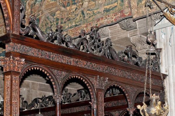 Cimasa del segmento di iconostasi posto di fronte alla navata centrale, a destra rispetto alla porta di ingresso al presbiterio: si compone di quattro candelabri lignei costituiti da volute e fogliami (il primo e il terzo da destra) o da figure a tutto tondo di animali fantastici poste frontalmente e sorreggenti sul capo o sul collo il piattello raccoglicera; i candelabri sono raccordati tra loro da figure a tutto tondo di animali fantastici aventi il corpo di serpente e testa di soldato con elmo (primo da destra), corpo di cane e testa di uomo (secondo da destra), corpo di cane e testa d'uomo (terzo da destra), corpo di drago e testa di cane (quarto da destra).