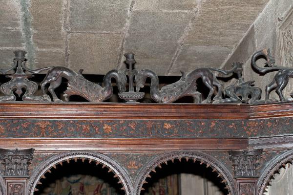 Cimasa del segmento di iconostasi posto sul lato destro del presbiterio, lungo la navatella laterale: animali fantastici si alternano a candelieri di due tipologie diverse (con base a coppa o con piedi ferini)