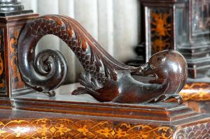 Bracciolo di stallo di coro costituito dalla figura scolpita di un animale fantastico avente la testa e il corpo di un delfino con pinne terminanti in foglie e la coda squamata e arrotolata di un serpente; una lunga foglia si sovrammette alla coda e al becco del pesce.