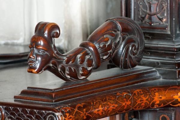 Bracciolo di stallo di coro costituito dalla figura scolpita di un animale fantastico avente la testa d'uomo e il corpo di lumaca: il corpo che fuoriesce dalla chiocciola è avvolto da foglie e stretto in un anello; sulla testa dell'uomo vi è una larga voluta a ricciolo.