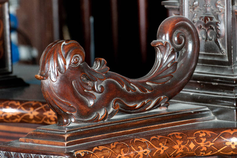 Bracciolo di stallo di coro costituito dalla figura scolpita di un animale fantastico avente la testa e il corpo di un delfino (?) e la coda arrotolata di un serpente; foglie arricciate fasciano in più punti l'animale.
