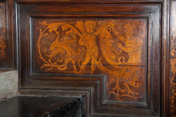 Pannello intarsiato ornato con una figura fantastica con busto d'uomo alato, zampe d'uccello e coda a voluta fogliacea terminante con testa di delfino; un putto con ali di farfalla mostra alla figura un elmo con mascherone con lingua arrotolata.