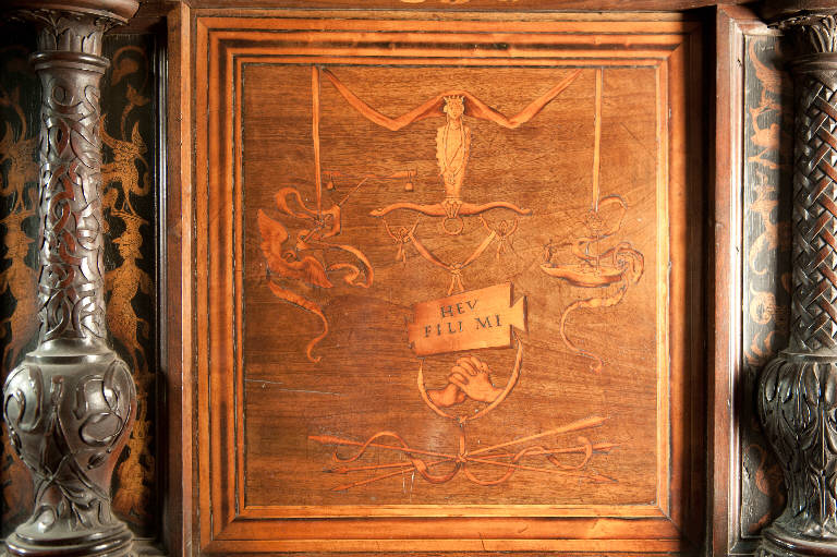 - NOTIZIE STORICO CRITICHE Nel 1522 il Consorzio della Misericordia Maggiore di Bergamo decise di dotare la basilica di Santa Maria di un nuovo coro confacente alla progettata pala d'argento e rame dell'altare maggiore e il 18 settembre di quell'anno deliberò di trattare con il legnaiolo e intarsiatore loverese Giovanni Francesco Capoferri per l'esecuzione dell'opera. L'artefice era noto a Bergamo fin dall'anno precedente per aver collaborato con fra' Damiano Zambelli all'esecuzione del coro intarsiato nella chiesa domenicana di Santo Stefano (ora in San Bartolomeo), inoltre il pittore Lorenzo Lotto gli aveva fatto tradurre in tarsia un suo disegno dell'Annunciazione (poi inserita nel bancale del celebrante, cfr. foto n. 904a) e questa dimostrazione aveva convinto il Consorzio ad affidare il lavoro al loverese. Al Capoferri, direttore dell'impresa del coro, fu affiancato il marangone Giovanni Belli di Ponteranica per i lavori di intaglio. Il principale teologo della città, fra Girolamo Terzi, fu incaricato di fornire le "inventiones" da dare ai pittori che avrebbero disegnato i cartoni da intarsiare. Il progetto della struttura del coro fu messo a punto dallo stesso Capoferri che visitò varie città del Nord-Italia per vedere altri cori intarsiati e che nel luglio-agosto 1523 si recò più volte a Milano dal pittore e architetto trevigliese Bernardo Zenale per sottoporgli il modello del coro. \nDopo aver acquisito alcuni cartoni forniti da pittori diversi, tra cui Lotto, Andrea Previtali, Francesco Rosso di Pavia, il 29 ottobre 1523 il Consorzio affidò i cartoni delle tarsie del coro al pittore bergamasco Nicolino Cabrini, di cui non si conosce nessuna opera se non la profilatura di alcune tarsie e che morì poco dopo, nel gennaio del 1524. Il 12 marzo 1524 il Consorzio incaricò dunque Lorenzo Lotto di eseguire i disegni per le tarsie da inserire negli schienali del coro ligneo della chiesa; dopo pochi mesi (2 giugno 1524) gli commissionò anche i pannelli intarsiati ("coperti") che dovevano proteggere le preziose tavolette. Le tarsie principali sarebbero state policrome, mentre i coperti a monocromo: questi ultimi avrebbero avuto come ornamento immagini simboliche in relazione coi contenuti delle "storie" da proteggere. Lotto inizialmente effettuò anche la 'profilatura' delle tarsie, ovvero la loro rifinitura finale mediante stucco nero per i contorni delle figure e con ombreggiatura a fuoco per il chiaro-scuro, ma un contrasto di natura economica frenò la sua disponibilità: il Consorzio gli riconobbe un compenso maggiore per le tarsie grandi dell'iconostasi. La profilatura fu allora effettuata dallo stesso Capoferri e dai pittori Andrea Previtali, Ludovico da Mantova e Lucano da Imola. Trasferitosi a Venezia nel dicembre del 1525, il pittore continuò a disegnare i cartoni delle tarsie e a inviarle a Bergamo fino al 1532, realizzando complessivamente 35 tarsie con storie bibliche di cui 4 grandi per l'iconostasi e 31 più piccole collocate oggi negli stalli del coro dei laici e nei due bancali del presbiterio; inoltre eseguì 32 tarsie a soggetto simbolico delle quali 28 costituivano i "coperti" delle tarsie istoriate e che oggi sono inserite negli schienali del coro degli ecclesiastici. \nNel 1531 si decise di ampliare la struttura del coro, trasferendo le tarsie istoriate ai due bancali dei celebranti e dei Rettori e al coro dei laici nell'abside, mentre nel coro degli ecclesistici rimasero i soli 'coperti' di soggetto simbolico. Solo i grandi quadri istoriati nel fronte dell'iconostasi rimasero con i loro coperti nella collocazione originaria. Nell'ottobre del 1533, consegnati dal Capoferri gli ultimi pannelli intarsiati, risultano già collocate negli stalli del coro dei religiosi le tarsie 'simboliche' degli ex-coperti, mentre le altre tarsie istoriate sarebbero rimaste per vent'anni nei depositi della Misericordia Maggiore.\nLa tarsia in oggetto fu ideata da Lotto nel 1527 come coperto della tarsia con il "Pianto di David per la morte di Assalonne" (poi