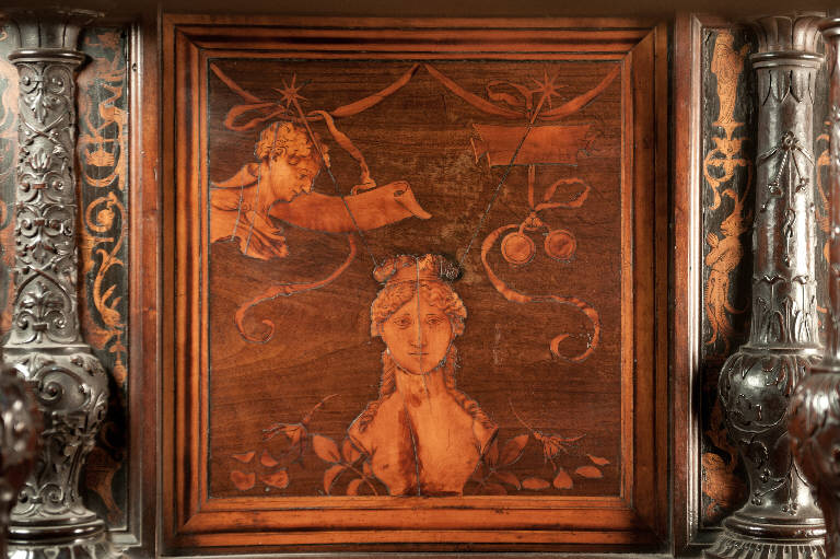 - NOTIZIE STORICO CRITICHE Nel 1522 il Consorzio della Misericordia Maggiore di Bergamo decise di dotare la basilica di Santa Maria di un nuovo coro confacente alla progettata pala d'argento e rame dell'altare maggiore e il 18 settembre di quell'anno deliberò di trattare con il legnaiolo e intarsiatore loverese Giovanni Francesco Capoferri per l'esecuzione dell'opera. L'artefice era noto a Bergamo fin dall'anno precedente per aver collaborato con fra' Damiano Zambelli all'esecuzione del coro intarsiato nella chiesa domenicana di Santo Stefano (ora in San Bartolomeo), inoltre il pittore Lorenzo Lotto gli aveva fatto tradurre in tarsia un suo disegno dell'Annunciazione (poi inserita nel bancale del celebrante, cfr. foto n. 904a) e questa dimostrazione aveva convinto il Consorzio ad affidare il lavoro al loverese. Al Capoferri, direttore dell'impresa del coro, fu affiancato il marangone Giovanni Belli di Ponteranica per i lavori di intaglio. Il principale teologo della città, fra Girolamo Terzi, fu incaricato di fornire le "inventiones" da dare ai pittori che avrebbero disegnato i cartoni da intarsiare. Il progetto della struttura del coro fu messo a punto dallo stesso Capoferri che visitò varie città del Nord-Italia per vedere altri cori intarsiati e che nel luglio-agosto 1523 si recò più volte a Milano dal pittore e architetto trevigliese Bernardo Zenale per sottoporgli il modello del coro. \nDopo aver acquisito alcuni cartoni forniti da pittori diversi, tra cui Lotto, Andrea Previtali, Francesco Rosso di Pavia, il 29 ottobre 1523 il Consorzio affidò i cartoni delle tarsie del coro al pittore bergamasco Nicolino Cabrini, di cui non si conosce nessuna opera se non la profilatura di alcune tarsie e che morì poco dopo, nel gennaio del 1524. Il 12 marzo 1524 il Consorzio incaricò dunque Lorenzo Lotto di eseguire i disegni per le tarsie da inserire negli schienali del coro ligneo della chiesa; dopo pochi mesi (2 giugno 1524) gli commissionò anche i pannelli intarsiati ("coperti") che dovevano proteggere le preziose tavolette. Le tarsie principali sarebbero state policrome, mentre i coperti a monocromo: questi ultimi avrebbero avuto come ornamento immagini simboliche in relazione coi contenuti delle "storie" da proteggere. Lotto inizialmente effettuò anche la 'profilatura' delle tarsie, ovvero la loro rifinitura finale mediante stucco nero per i contorni delle figure e con ombreggiatura a fuoco per il chiaro-scuro, ma un contrasto di natura economica frenò la sua disponibilità: il Consorzio gli riconobbe un compenso maggiore per le tarsie grandi dell'iconostasi. La profilatura fu allora effettuata dallo stesso Capoferri e dai pittori Andrea Previtali, Ludovico da Mantova e Lucano da Imola. Trasferitosi a Venezia nel dicembre del 1525, il pittore continuò a disegnare i cartoni delle tarsie e a inviarle a Bergamo fino al 1532, realizzando complessivamente 35 tarsie con storie bibliche di cui 4 grandi per l'iconostasi e 31 più piccole collocate oggi negli stalli del coro dei laici e nei due bancali del presbiterio; inoltre eseguì 32 tarsie a soggetto simbolico delle quali 28 costituivano i "coperti" delle tarsie istoriate e che oggi sono inserite negli schienali del coro degli ecclesiastici. \nNel 1531 si decise di ampliare la struttura del coro, trasferendo le tarsie istoriate ai due bancali dei celebranti e dei Rettori e al coro dei laici nell'abside, mentre nel coro degli ecclesistici rimasero i soli 'coperti' di soggetto simbolico. Solo i grandi quadri istoriati nel fronte dell'iconostasi rimasero con i loro coperti nella collocazione originaria. Nell'ottobre del 1533, consegnati dal Capoferri gli ultimi pannelli intarsiati, risultano già collocate negli stalli del coro dei religiosi le tarsie 'simboliche' degli ex-coperti, mentre le altre tarsie istoriate sarebbero rimaste per vent'anni nei depositi della Misericordia Maggiore.\nLa tarsia in oggetto fu ideata da Lotto entro il febbraio 1527, come coperto della tarsia con "Amnon che violenta la sorella Tamar"