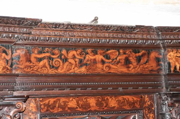 - NOTIZIE STORICO CRITICHE Nel 1522 il Consorzio della Misericordia Maggiore di Bergamo decise di dotare la basilica di Santa Maria di un nuovo coro e il 18 settembre di quell'anno deliberò di trattare con il legnaiolo e intarsiatore loverese Giovanni Francesco Capoferri per l'esecuzione dell'opera. L'artefice era noto a Bergamo fin dall'anno precedente per aver collaborato con fra' Damiano Zambelli all'esecuzione del coro intarsiato nella chiesa domenicana di Santo Stefano (ora in San Bartolomeo), inoltre nel 1522 il pittore Lorenzo Lotto gli aveva fatto tradurre in tarsia un suo disegno dell'Annunciazione (poi inserita nel bancale del celebrante, cfr. foto n. 904a) e questa dimostrazione aveva convinto il Consorzio ad affidare il lavoro al loverese. Al Capoferri, direttore dell'impresa del coro, fu affiancato il marangone Giovanni Belli di Ponteranica per i lavori di intaglio. Il principale teologo della città, fra Girolamo Terzi, fu incaricato di fornire le "inventiones" da dare ai pittori che avrebbero disegnato i cartoni da intarsiare.\nDopo aver acquisito alcuni cartoni forniti da pittori diversi, tra cui Lotto, Andrea Previtali, Francesco Rosso di Pavia, il 29 ottobre 1523 il Consorzio affidò i cartoni delle tarsie del coro al pressoché sconosciuto Nicolino Cabrini, che morì poco dopo. Il 12 marzo 1524 il Consorzio incaricò dunque Lorenzo Lotto di eseguire i disegni per le tarsie e dopo pochi mesi (2 giugno 1524) gli commissionò anche i pannelli intarsiati ("coperti") con imprese simboliche che dovevano proteggere le preziose tavolette. Lotto inizialmente effettuò anche la 'profilatura' delle tarsie, ovvero la loro rifinitura finale mediante stucco nero per i contorni delle figure e con ombreggiatura a fuoco per il chiaro-scuro, ma un contrasto di natura economica frenò la sua disponibilità. La profilatura fu allora effettuata dallo stesso Capoferri e dai pittori Andrea Previtali, Ludovico da Mantova e Lucano da Imola. Trasferitosi a Venezia nel dicembre del 1525, il pittore continuò a disegnare i cartoni delle tarsie e a inviarle a Bergamo fino al 1532, realizzando complessivamente 35 tarsie con storie bibliche di cui 4 grandi per l'iconostasi e 31 più piccole collocate oggi negli stalli del coro dei laici e nei due bancali del presbiterio; inoltre eseguì 32 tarsie a soggetto simbolico delle quali 28 costituivano i "coperti" delle tarsie istoriate e che oggi sono inserite negli schienali del coro degli ecclesiastici. \nNel 1531 si decise di ampliare la struttura del coro, trasferendo le tarsie istoriate del coro degli ecclesiastici al bancale del celebrante, a quello dei Rettori e al coro dei laici nell'abside, mentre nel coro dei religiosi rimasero i soli 'coperti' di soggetto simbolico: dei modelletti delle nuove strutture del presbiterio (bancali e coro dei laici) fu incaricato Marcantonio, figlio dell'architetto Pietro Isabello (1531-1532). Nell'ottobre del 1533, consegnati dal Capoferri gli ultimi pannelli intarsiati, risultano già collocate negli stalli del coro dei religiosi le tarsie 'simboliche' degli ex-coperti, mentre le altre tarsie istoriate rimasero per vent'anni nei depositi della Misericordia Maggiore. La fabbrica del coro fu ripresa nel 1547-1549 con l'incarico di alcuni disegni al pittore Filippo Zanchi e all'intervento dell'intarsiatore Paolo Sabatini da Pesaro e di Giovanni Donato Capoferri, detto Zinino, figlio di Giovan Francesco, che fu limitato però solo ad alcune cornici. Solo negli anni 1553-1555 i banchi della cappella maggiore furono portati a termine in base al modello elaborato dall'Isabello: nel 1553 fu chiamato a Bergamo Giovan Pietro Capoferri, fratellastro di Giovan Francesco, affermato intagliatore e intarsiatore, per la realizzazione del bancale del celebrante e della parte sinistra del coro dei laici, mentre ad Alessandro Belli, già attivo col padre nel coro degli ecclesiastici, furono assegnati il bancale dei Rettori e la parte destra del coro dei laici. Entrambi sono da considerare, oltre che artefici, anch