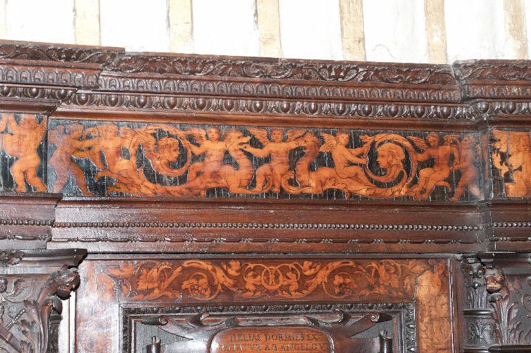 - NOTIZIE STORICO CRITICHE Nel 1522 il Consorzio della Misericordia Maggiore di Bergamo decise di dotare la basilica di Santa Maria di un nuovo coro e il 18 settembre di quell'anno deliberò di trattare con il legnaiolo e intarsiatore loverese Giovanni Francesco Capoferri per l'esecuzione dell'opera. L'artefice era noto a Bergamo fin dall'anno precedente per aver collaborato con fra' Damiano Zambelli all'esecuzione del coro intarsiato nella chiesa domenicana di Santo Stefano (ora in San Bartolomeo), inoltre nel 1522 il pittore Lorenzo Lotto gli aveva fatto tradurre in tarsia un suo disegno dell'Annunciazione (poi inserita nel bancale del celebrante, cfr. foto n. 904a) e questa dimostrazione aveva convinto il Consorzio ad affidare il lavoro al loverese. Al Capoferri, direttore dell'impresa del coro, fu affiancato il marangone Giovanni Belli di Ponteranica per i lavori di intaglio. Il principale teologo della città, fra Girolamo Terzi, fu incaricato di fornire le "inventiones" da dare ai pittori che avrebbero disegnato i cartoni da intarsiare.\nDopo aver acquisito alcuni cartoni forniti da pittori diversi, tra cui Lotto, Andrea Previtali, Francesco Rosso di Pavia, il 29 ottobre 1523 il Consorzio affidò i cartoni delle tarsie del coro al pressoché sconosciuto Nicolino Cabrini, che morì poco dopo. Il 12 marzo 1524 il Consorzio incaricò dunque Lorenzo Lotto di eseguire i disegni per le tarsie e dopo pochi mesi (2 giugno 1524) gli commissionò anche i pannelli intarsiati ("coperti") con imprese simboliche che dovevano proteggere le preziose tavolette. Lotto inizialmente effettuò anche la 'profilatura' delle tarsie, ovvero la loro rifinitura finale mediante stucco nero per i contorni delle figure e con ombreggiatura a fuoco per il chiaro-scuro, ma un contrasto di natura economica frenò la sua disponibilità. La profilatura fu allora effettuata dallo stesso Capoferri e dai pittori Andrea Previtali, Ludovico da Mantova e Lucano da Imola. Trasferitosi a Venezia nel dicembre del 1525, il pittore continuò a disegnare i cartoni delle tarsie e a inviarle a Bergamo fino al 1532, realizzando complessivamente 35 tarsie con storie bibliche di cui 4 grandi per l'iconostasi e 31 più piccole collocate oggi negli stalli del coro dei laici e nei due bancali del presbiterio; inoltre eseguì 32 tarsie a soggetto simbolico delle quali 28 costituivano i "coperti" delle tarsie istoriate e che oggi sono inserite negli schienali del coro degli ecclesiastici. \nNel 1531 si decise di ampliare la struttura del coro, trasferendo le tarsie istoriate del coro degli ecclesiastici al bancale del celebrante, a quello dei Rettori e al coro dei laici nell'abside, mentre nel coro dei religiosi rimasero i soli 'coperti' di soggetto simbolico: dei modelletti delle nuove strutture del presbiterio (bancali e coro dei laici) fu incaricato Marcantonio, figlio dell'architetto Pietro Isabello (1531-1532). Nell'ottobre del 1533, consegnati dal Capoferri gli ultimi pannelli intarsiati, risultano già collocate negli stalli del coro dei religiosi le tarsie 'simboliche' degli ex-coperti, mentre le altre tarsie istoriate rimasero per vent'anni nei depositi della Misericordia Maggiore. La fabbrica del coro fu ripresa nel 1547-1549 con l'incarico di alcuni disegni al pittore Filippo Zanchi e all'intervento dell'intarsiatore Paolo Sabatini da Pesaro e di Giovanni Donato Capoferri, detto Zinino, figlio di Giovan Francesco, che fu limitato però solo ad alcune cornici. Solo negli anni 1553-1555 i banchi della cappella maggiore furono portati a termine in base al modello elaborato dall'Isabello: nel 1553 fu chiamato a Bergamo Giovan Pietro Capoferri, fratellastro di Giovan Francesco, affermato intagliatore e intarsiatore, per la realizzazione del bancale del celebrante e della parte sinistra del coro dei laici, mentre ad Alessandro Belli, già attivo col padre nel coro degli ecclesiastici, furono assegnati il bancale dei Rettori e la parte destra del coro dei laici. Entrambi sono da considerare, oltre che artefici, anch
