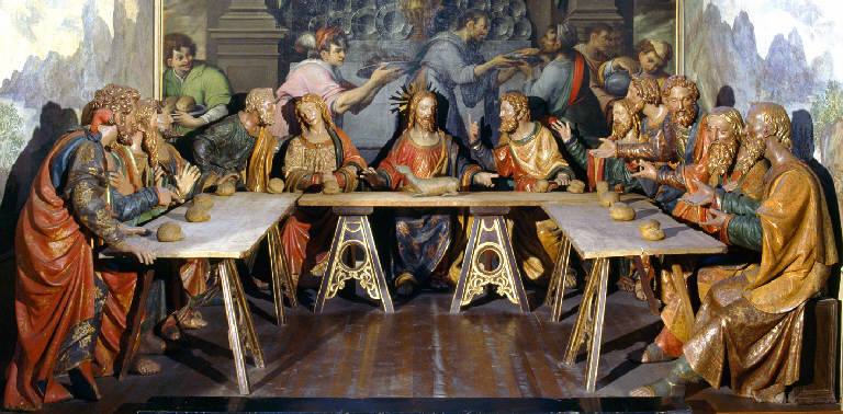 - NOTIZIE STORICO CRITICHE Appena terminata la cappella della Passione (1530), i deputati del Santuario decisero la sistemazione della cappella del Cenacolo, di fronte ad essa.\nIl gruppo ligneo fu eseguito nuovamente ad opera di Andrea da Milano con le relative dorature di Alberto da Lodi; la decorazione della volta, invece, fu affidata a Luini, che dipinse in riquadri a due a due simmetrici quattro angeli recanti gli strumenti della Passione e l'Eterno Padre che si affaccia dalla balaustra nell'oculo centrale.\nQuando fu conclusa la decorazione, Andrea da Milano diede disposizioni (1533) in merito alla costruzione del sopralzo e al posizionamento delle sue statue (di cui però non si conosce l'esatta posizione): in questa occasione fornì le sculture di un agnello, di tre vasi e di quindici pani da mettere sulla mensa e anche i due busti dei profeti Isaia e Abacuc per i tondi della facciata della cappella. In seguito la mensa si arricchì di altre suppellettili, quali dodici bicchieri, tre oliere e tre salini; tutti elementi che ora non sono più apparecchiati.\nInoltre l'autore completò la scenografia intagliando altre cinque statue, collocate su due mensole nella parete di fondo: a sinistra Gesù nell'orto del Getzemani con l'angelo, a destra gli Apostoli dormienti.\nLa cappella subì diverse trasformazioni nei secoli, il più importante dei quali avvenne nel 1596 , ad opera dell 'Ing. Lelio Buzzi, che dirigeva i lavori della facciata appena iniziati . \nIn seguito alla visita pastorale del mons. Albergato (o Albogasio), visitatore e vicario generale del card. Federico Borromeo, fu ordinato che i due piccoli altari delle cappelle della Passione e del Cenacolo venissero sostituiti da nuovi altari di dimensioni maggiori, atti alla celebrazione della messa. Per questo motivo la cappella venne allungata: tutto il complesso delle statue e del rialzo vennero smontati e ricollocati nel 1597, ma non fu mantenuta la stessa disposizione dell'artista poiché fu rifatta la tavola, come è testimoniato in una registrazione contabile. \nLe statue furono montate secondo il seguente schema: Taddeo, Giacomo Minore, Andrea, Giuda, Bartolomeo, Giovanni, Cristo, Pietro, Giacomo Maggiore, Tommaso, Matteo, Simone e Filippo; quindi dall'aspetto differente rispetto a quello attuale. \nCon l'allungamento rimasero solo le tredici statue della Cena, la nuova decorazione della volta venne completata da Francesco Volpino con altri due angeli in stile luinesco.\nAndarono persi, infatti, gli affreschi di Cesare Magni sulla parete di fondo poichè fu abbattuta e su quelle laterali per il rovinio di alcune parti murarie: le statue dell'orazione dell'orto non furono più disposte nella posizione originaria per la presenza di una nuova grande apertura. I deputati, però, volendo che la scena fosse ancora rappresentata, il 25 ottobre del 1596, commissionarono a Camillo Procaccini di dipingere tre tele, aventi per soggetto Gesù nell'orto e il bacio di Giuda (sulle pareti laterali) e i servi che attendono alla tavola (sulla parete di fondo).\nAndrea da Milano e Alberto da Lodi anticipano Gaudenzio Ferrari, poco prima che egli lavori al Santuario, costruendo una rappresentazione sacra in stile tableaux vivant, come già ne aveva fatto esperienza l'artista valduggiano presso il Sacro Monte di Varallo (dal 1507).\nLo scultore modella i volti di Cristo e degli Apostoli, crea giochi raffinati con i panneggi delle vesti, caratterizza la gestualità tentando di tradurre i moti dell'animo e le sottili vibrazioni psicologiche del Cenacolo vinciano, facendo immergere il fruitore nell'atmosfera del dramma di Cristo, colto proprio nel momento dell'annuncio, che vedrà traditore proprio uno degli apostoli. L'artista racconta lo stesso momento descritto da Leonardo, collocando le figure secondo lo stesso schema compositivo, da sinistra a destra: Bartolomeo, Giacomo Minore, Andrea, Giuda, Pietro, Giovanni , Gesù, Tommaso, Giacomo Maggiore, Filippo, Matteo, Taddeo e Simone. \nProbabilmente l'autore è stato aiutato da uno o forse più allievi di bottega per esempio nell'apostolo Giuda e in tutte quei personaggi con larghi panneggi rigonfi.\nQuest'opera costituisce un unicum di riproduzione del Cenacolo con sculture lignee a grandezza naturale, se si esclude una rivisitazione contemporanea di Marisol, conservato al Moma di New York.
