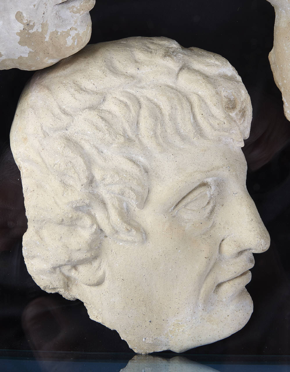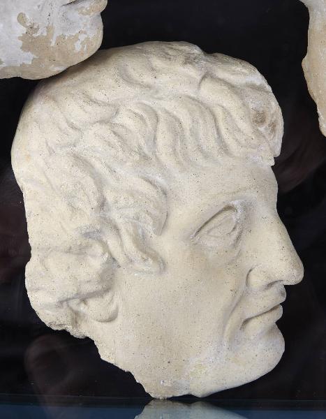 Testa virile, ritratta di profilo e rivolta verso destra; capelli corti e mossi.