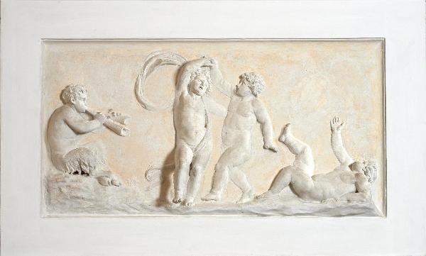 Gruppo di tre putti e fauno. A sinistra un fauno seduto a gambe incorciate sopra una roccia suona una zampogna. Al centro un putto stante danza con un altro putto raffigurato voltato verso sinitra e di profilo; i due si tengono per mano. A destra un putto è raffigurato supino e di profilo, con gamba e braccio sinistro rivolti verso l'alto.