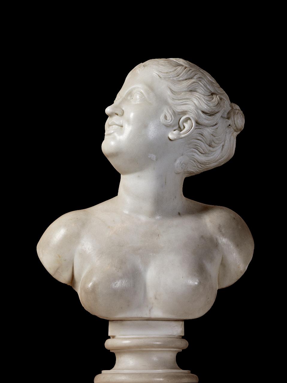 Busto femminile, nudo ritratto di profilo. Capelli raccolti sulla nuca e testa rivolta verso l'alto.