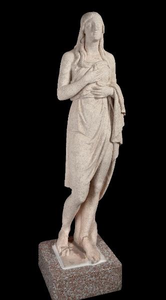 Figura femminile stante, avvolta in un saio corto, stretto alla vita da un cilicio. Viso rivolto verso l'alto con capelli lunghi, sciolti sulle spalle. Braccia portate al petto.