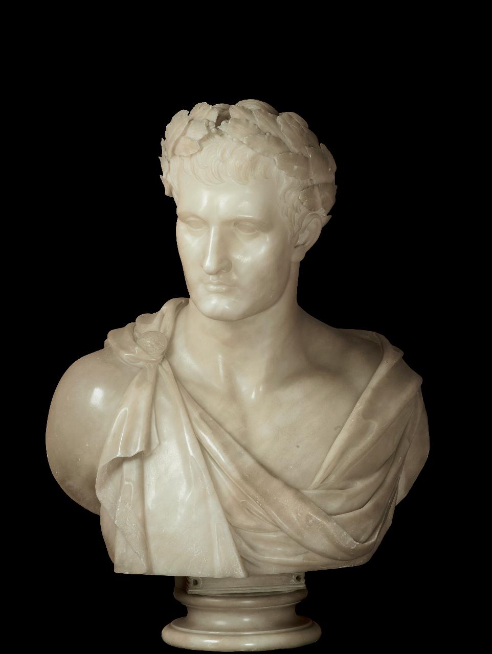 Busto maschile, volto di tre quarti. Capelli corti e sguardo rivolto verso il basso. Indossa una tunica fermata sulla spalla destra da un fermaglio e una corna d'alloro sul capo.