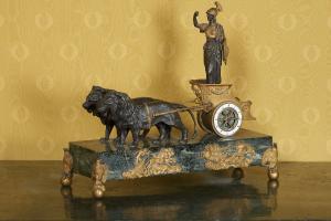 Biga trainata da due leoni, poggiante su una base di marmo verde sostenuta ai lati da quattro aquile, ciascuna sopra un globo; le ruote sono il quadrante dell'orologio. Sulla biga figura femminile stante con indosso una tunica e un elmo; con il braccio sinistro regge uno scudo e il destro è alzato.