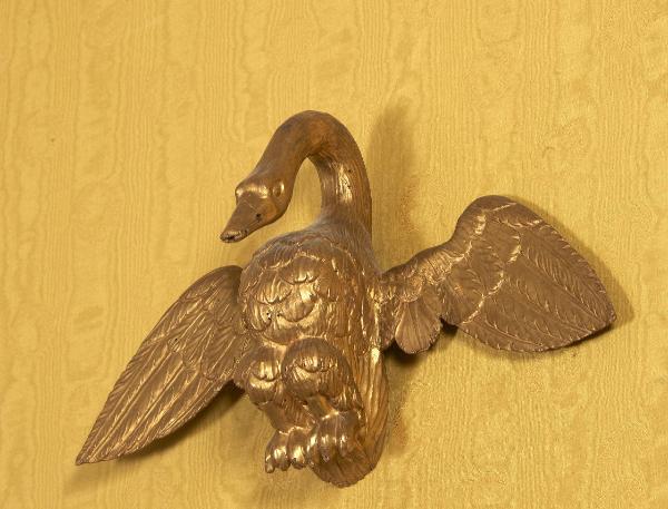 Cigno con ali spiegate e testa frontale.