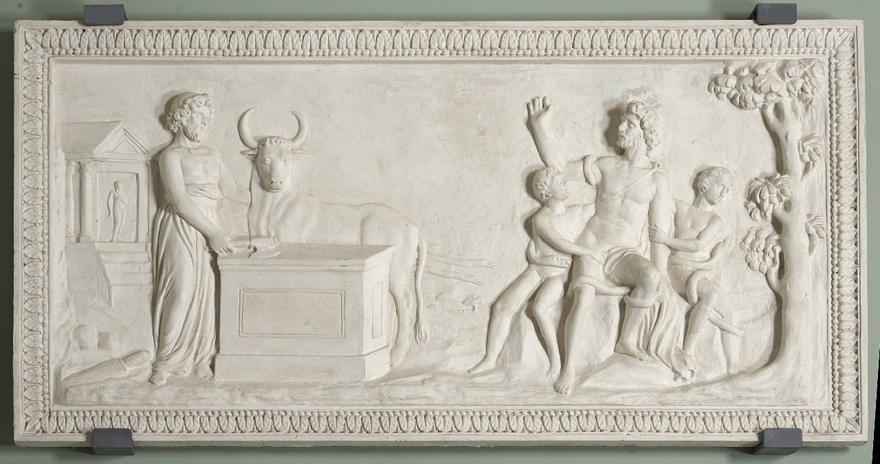 A sinistra figura maschile stante, con tunica avvolta attorno alla vita e torso scoperto. Nella mano destra regge un'ascia, mentre con la sinistra trattiene un toro; sullo sfondo compare un tempio votivo. A destra gruppo di tre persone, un adulto al centro e due fanciulli ai lati, tutti seduti sopra una roccia e avvinghiati tra loro da un serpente.