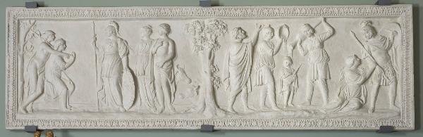 Da sinistra: una coppia di figure maschili, di cui una in piedi con un cappello alato, appoggiata a un'altra figura seduta e con una mela nella mano sinistra. Davanti a loro, tre figure femminili in piedi e di profilo: la prima indossa una tunica, un elmo e porta una lancia e uno scudo; la seconda indossa una tunica e poggia la mano destra sulla spalla sinistra della donna davanti a lei; la terza, nuda, ha un panno che, dalla spalla destra, scende a coprirle il pube.\nDa destra: un uomo con lancia e scudo è trattenuto per il braccio da una figura femminile accanto a lui; segue un gruppo di due figure maschili, anch'essi con elmo e scudo, disposti intorno a un bambino mentre gettano dell'acqua sul suo capo. Accanto a loro, una figura maschile con una tunica rivolge gli occhi e le mani al cielo.\nSi possono osservare elementi naturali come alberi e animali, tra cui buoi.