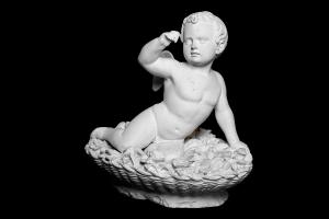 Putto alato in torsione, seduto dentro una canestra ricolma di fiori e frutti. Con la mano sinistra afferra il cestino; la mano destra è alzata verso l'alto.