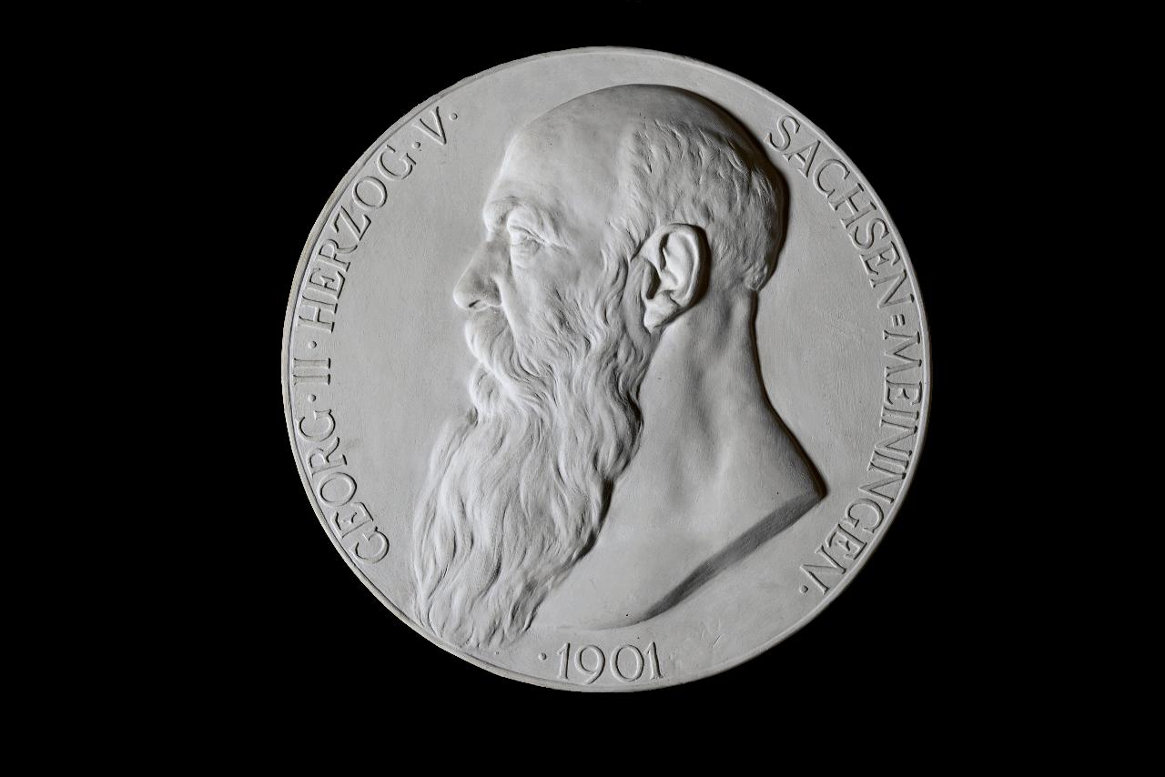 - NOTIZIE STORICO CRITICHE Caspar Ritter von Zumbusch è stato uno dei maggiori scultori e medaglisti tedeschi. La medaglia in gesso qui esposta può ritenersi un modello per una successiva realizzazione in bronzo o marmo, di un tondo con l'effigie del Duca Giorgio II von Sachsen-Meiningen, ormai anziano come rivela la lunga barba e l'incipiente calvizie. Dallo stesso medaglione nel 1915 vennero poi create le medaglie commemorative per la morte del duca, avvenuta il 26 giugno 1914.
