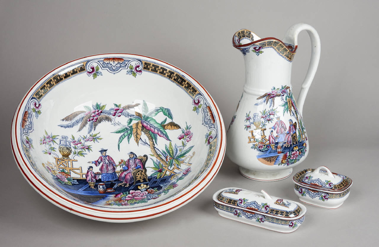 Servizio da lavabo a parete spessa, solida e bianca, modellata in serie a stampo. Il decoro con scena cinese è realizzato in decalcomania colorata con colori a piccolo fuoco industriali. Tutti i pezzi portano la fascia di cornice col motivo a catena geometrica interrotto da un elemento mistilineo con girali che ospita fiori tripetali stilizzati di gusto orientale. Sul catino e sulla brocca è presente una famiglia nobile cinese, in posa al centro, circondata da elementi floreali. Il servizio è composto da: un catino, una brocca, una portaspazzolino e un portasapone.