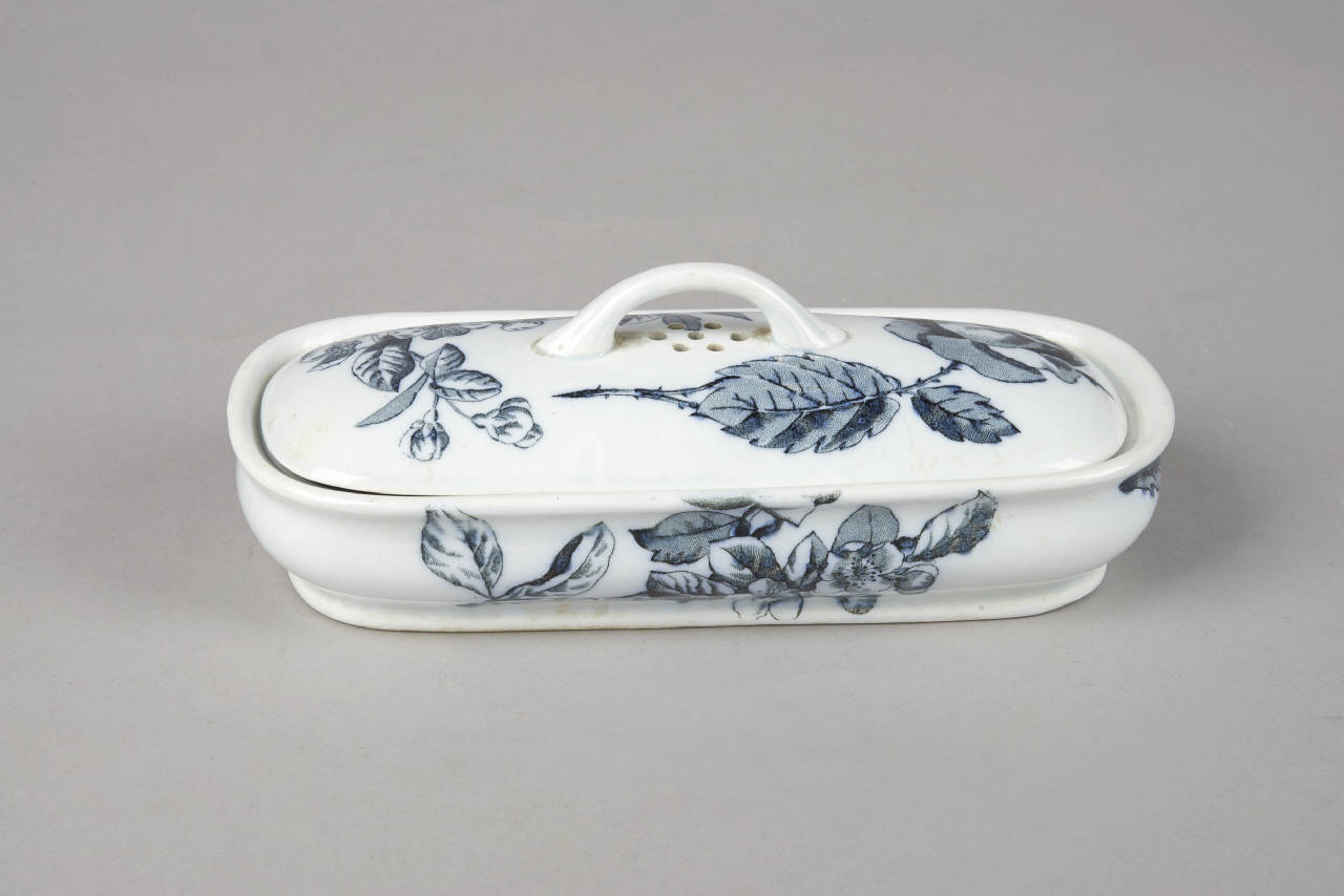 Portaspazzolino a vaschetta, con due sottili elementi fissi orizzontali per poggiare spazzolini all'interno; ha coperchio traforato al centro sotto l'ansa. Decoro a decalcomania in monocromia blu con grandi fiori dal disegno stilizzato e lunghe foglie; sono presenti anche mazzetti floreali secondari.