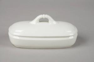 Portaspazzolino con vaschetta rettangolare dagli angoli addolciti con un sottile solco incavato e l'orlo leggermente estroflesso. Il coperchio rigonfio ha piccola presa a ponte con anello centrale. All'interno i due piccoli piani di supporto fissi per lo spazzolino. La parete spessa bianca è solo rivestita dalla vernice liscia vetrosa senza decorazioni nè plastiche nè pittoriche.
