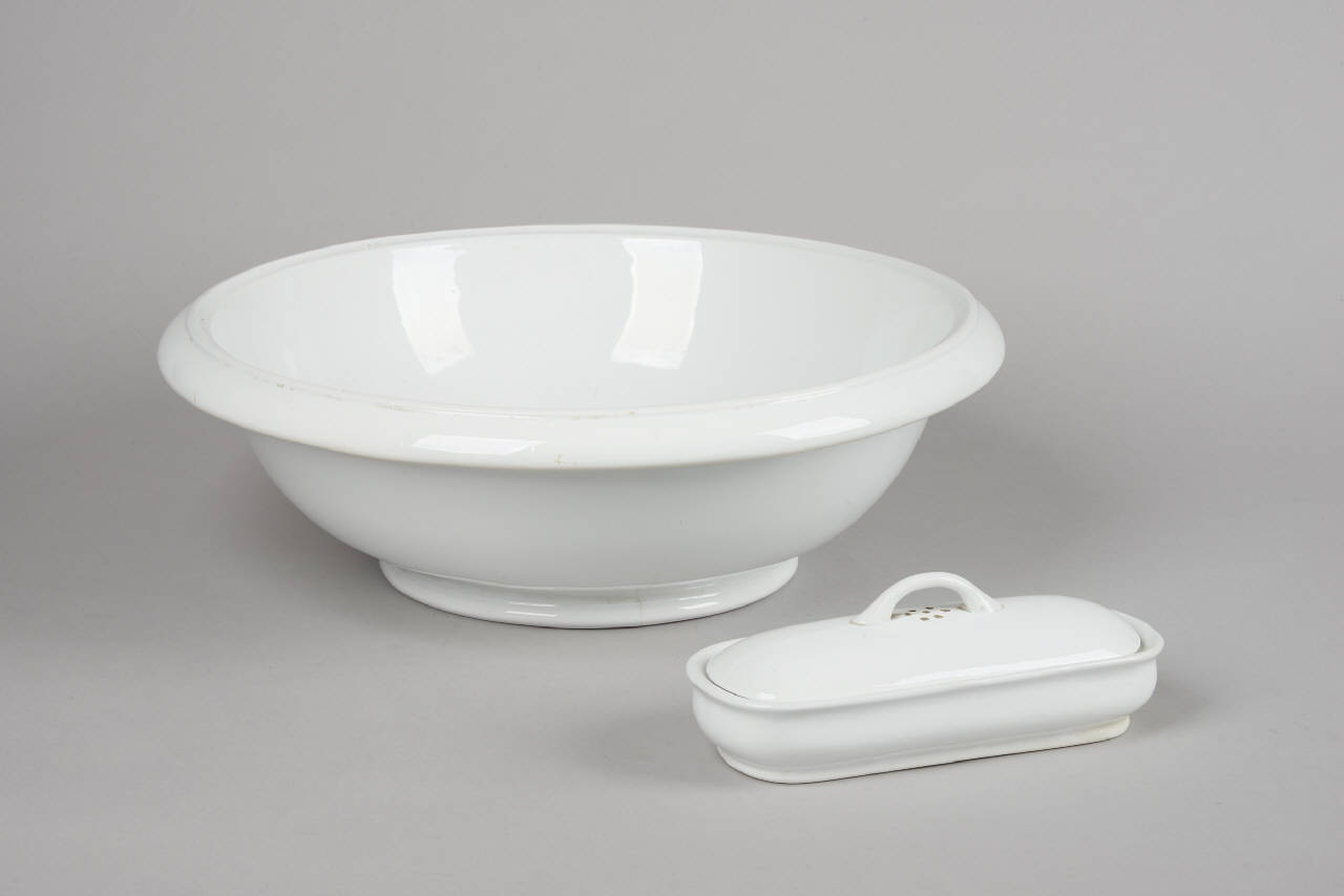 Parte di servizio da lavabo, privo di decorazione. Il servizio è composto da un catino e un portaspazzolino.