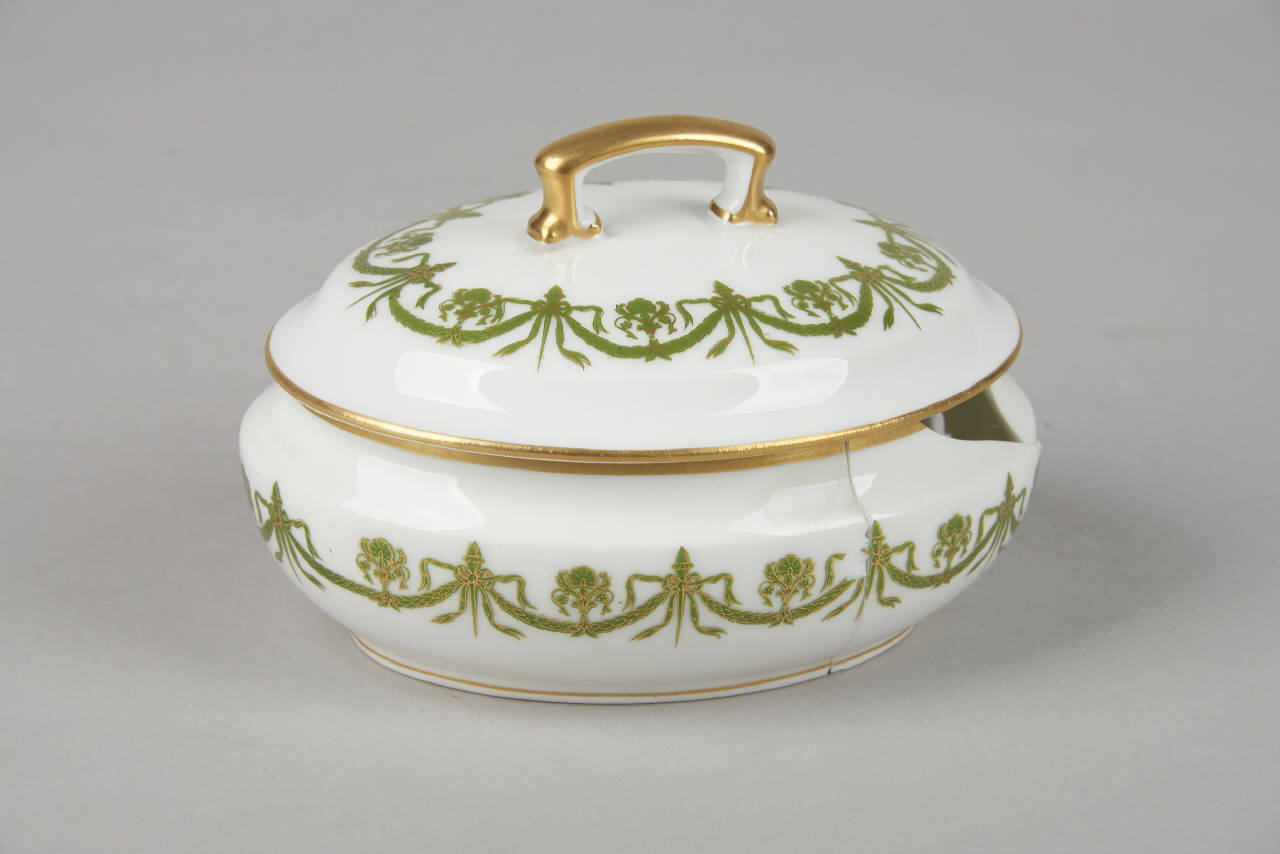Portasapone ellittico con superfici liscie, rigonfie e coperchio con anse a arco ribassato. Motivo decorativo a fascia, dipinto in verde e oro di stile neoclassico con sottile festone di fiocchi, nastri sottili e elementi floreali stilizzati in verde e oro. Anche le forme sono profilate in oro.